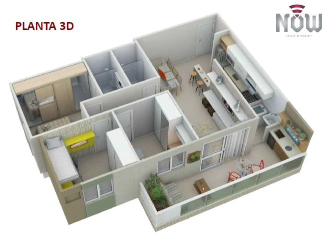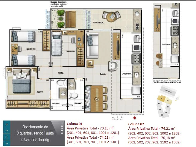Apartamentos de 3 quartos com suíte de 74,21m²;
