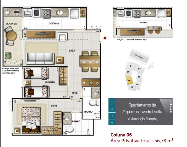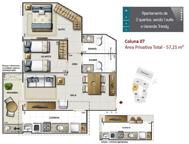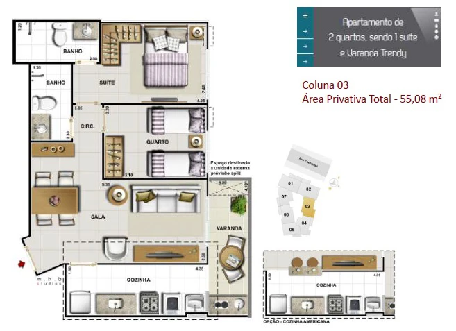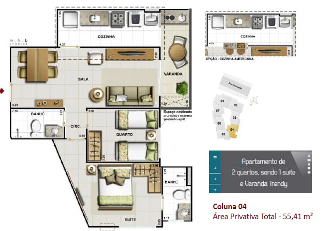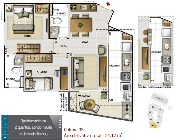 Apartamentos de 2 quartos, com suíte de 54,17m²;