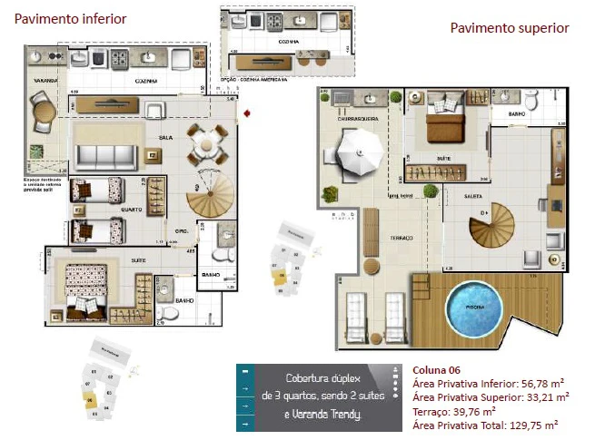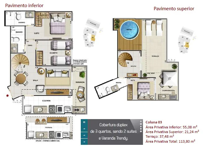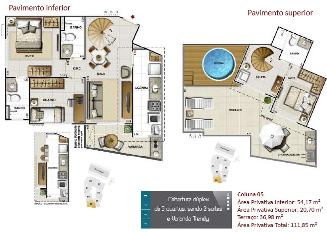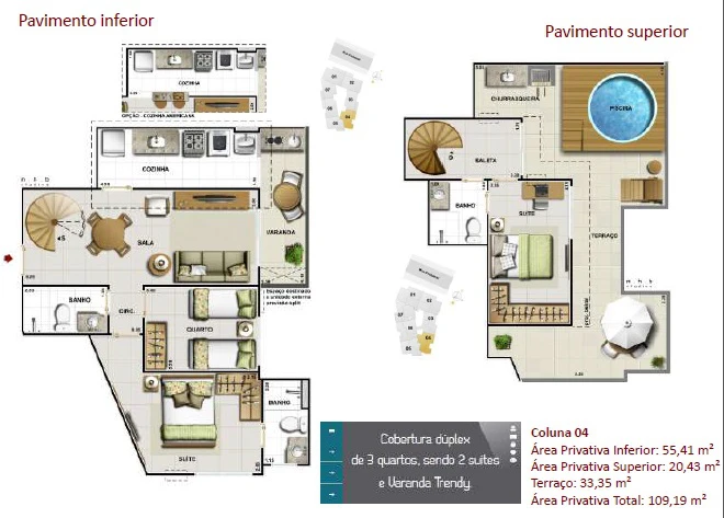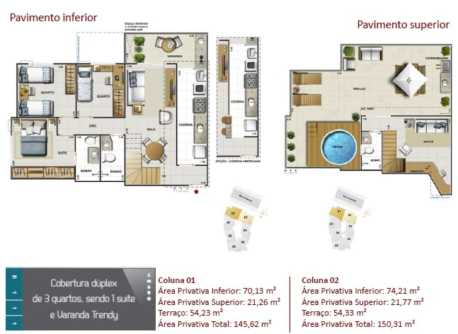 Coberturas Dúplex de 3 quartos, sendo até 2 suítes, com 109 a 150m².